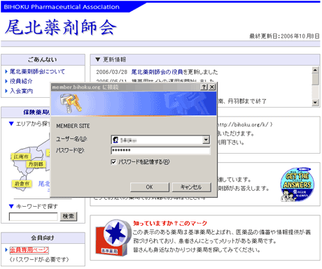 会員向けページのリンクをクリックすると、認証ダイアログが開くので、IDとパスワードを入力してください。 「パスワードを記憶する」にチェックを入れると次回以降入力の手間が省けます。 パスワードはメールで配信される「尾北薬剤師会NEWS」の末尾に記入されています。 メーリングリストに登録されていない正会員の方は以下の申請用紙を組織情報部会までFAXしてください。 [メーリングリスト登録申請用紙] |